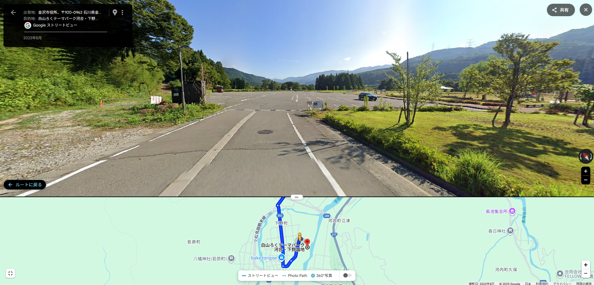 5. アクセス:【金沢方面から】 国道157号、県道45号、県道103号、県道44号 から 白山市 下野町 まで行く 白山ろくテーマパーク河合・下野園地 〒920-2374 石川県白山市下野町 45 分(24.0 km) 6. 注意事項: ・当日やむを得ず欠席する場合は、必ず下記連絡先までお電話をお願いします。 【前日までの連絡先】 ☎ 076-264-5272,5273 ✉ manabi@adm.kanazawa-u.ac.jp 【講座当日の連絡先】 ☎ 080-8995-1391(公開講座専用携帯) ※当日、キャンセル以外のお問合せの場合も、公開講座専用携帯まで お電話くださいますようお願いします。 ・歩きやすい靴や服装のご準備をお願いします。飲み物、天候によっては 雨具をお持ちください。 ・見学先には一般の方がいらっしゃいますので、他の利用者の妨げに ならないようご協力をお願いします。 【参考】